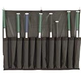 Made from heavy-duty reinforced vinyl with mesh backing. Holds 12 bats, attaches to chain link fence.